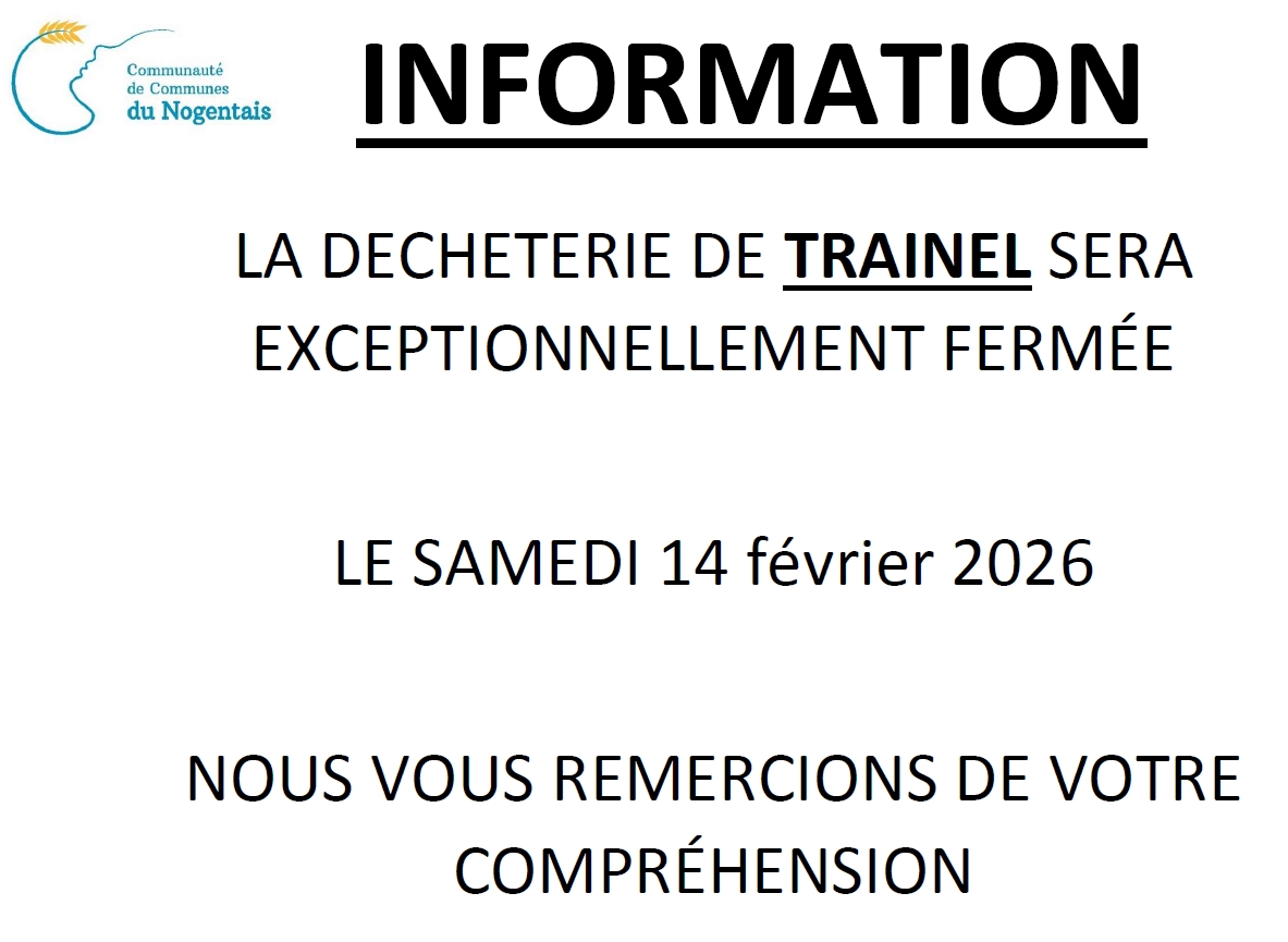 FERMETURE exceptionnelle de la déchèterie de TRAINEL le 14 / 02 / 2026
