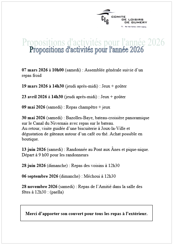 Le Comité de Loisirs de Gumery anime notre village. Il met en place de nombreuses animations joyeuses, conviviales et variées auxquelles tous les habitants de Gumery peuvent participer. Tous les ans, au cours du mois de février, une assemblée générale a lieu durant laquelle les propositions du bureau ainsi que celles des adhérents sont soumises au vote. Cela détermine les activités de l’année en cours. Les activités proposées sont les suivantes : pêches à la truite, randonnées pédestres, concours de pétanque, sorties culturelles, expositions, soirées dansantes à thème, repas, … Pour les activités payantes, des tarifs préférentiels sont proposés aux adhérents moyennant une adhésion annuelle de 12 €. Le bureau du Comité est composé de : – Michel Lucquin, président, – Claude Josselin vice président – Patrice Lucquin, trésorier, – Murielle Gouébault, secrétaire, – Monique Poupon, secrétaire adjointe.