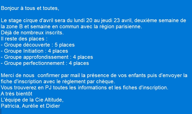 Infos stages cirque avril 2026