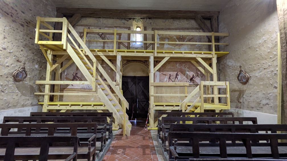 Un échafaudage a été mis en place devant la fresque « l’enfer et le paradis » qui sera restaurée dès que les travaux de la toiture seront effectués. En effet, nous avons constaté des infiltrations d’eau qui ont en partie détruit le plancher situé au-dessus de la fresque qui devra être lui aussi réparé.