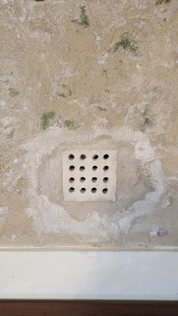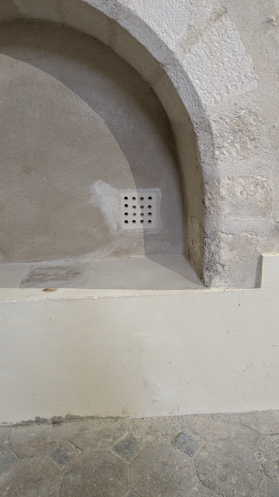 Afin d’assainir les murs qui développent du salpêtre et le sol de l’église qui verdit du fait de l’humidité, le conseil municipal a décidé de mettre en place des bouches d’aération. Celles-ci sont au nombre de 6.