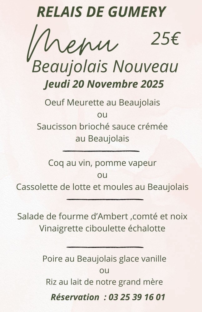 RELAIS DE GUMERY – MENU BEAUJOLAIS NOUVEAU – JEUDI 20 NOVEMBRE 2025